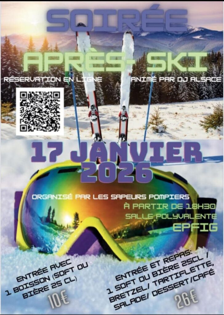Les Sapeurs Pompiers d’Epfig-Bernardvillé vous proposent une soirée « APRÈS-SKI » animée par DJ ALSACE le samedi 17 JANVIER 2026 dès 18h30 – Salle Polyvalente d’Epfig. MENU à 26¤ : apéritif – tartiflette – salade – dessert – café Entrée à 10¤ (sans repas) avec une boisson à partir de 21h30 (en fonction des places disponibles) Réservation : scannez le QR-CODE présent sur l’affiche L’article SOIREE APRES-SKI est apparu en premier sur Commune d'Epfig.