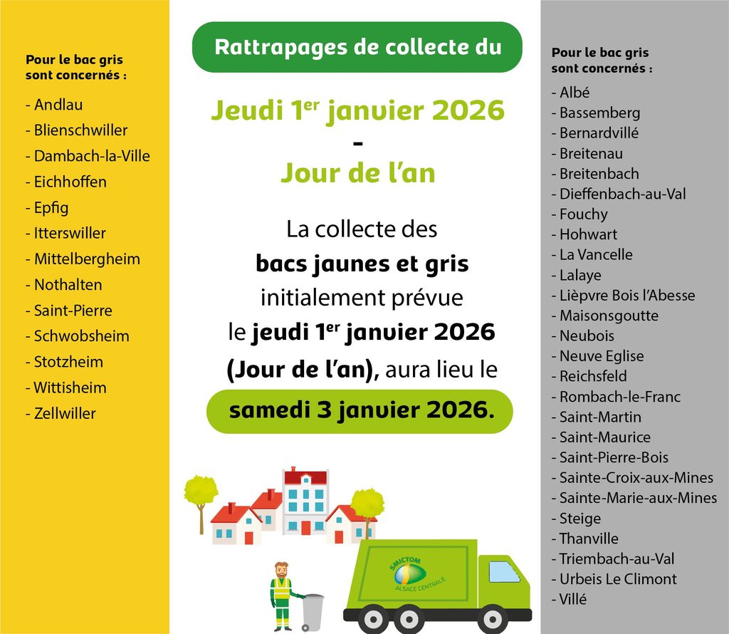 En raison du jeudi 1er janvier 2026 férié, les collectes des bacs jaunes et gris prévues ce jour-là seront organisées le samedi 3 janvier 2026. Pour ne plus oublier de sortir votre bac, téléchargez l’application “Mon Compte SMICTOM” et recevez une notification la veille de la collecte ! Consultez le calendrier de collecte de fin d’année (lien ci-dessous). L’article Rattrapage de collecte des bacs jaune – Nouvel an est apparu en premier sur Commune d'Epfig.