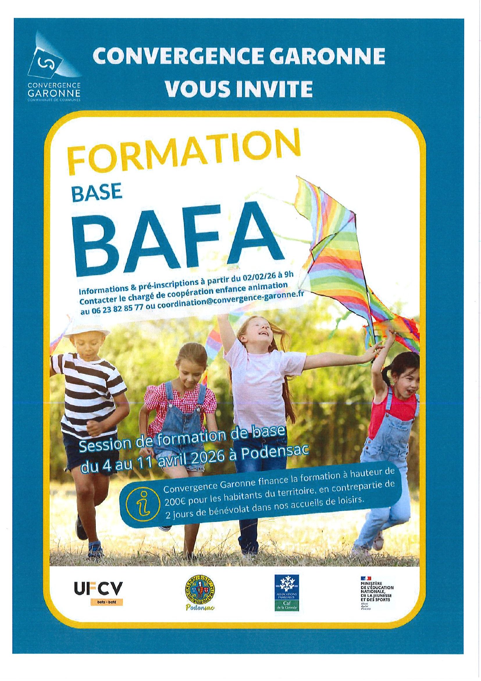 La Communauté de communes Convergence Garonne organise en partenariat avec l'UFCV et la commune de Podensac, une session de formation générale du BAFA lors des vacances du samedi 4 au samedi 11 Avril 2026. La Communauté de communes Convergence Garonne participe à hauteur de 200 euros pour tous les stagiaires résidant sur le territoire. En contrepartie, le stagiaire s'engage à effectuer deux journées de bénévolat sur un des accueils de loisirs communautaires en qualité d'animateur(trice). – Nombre de places limité.