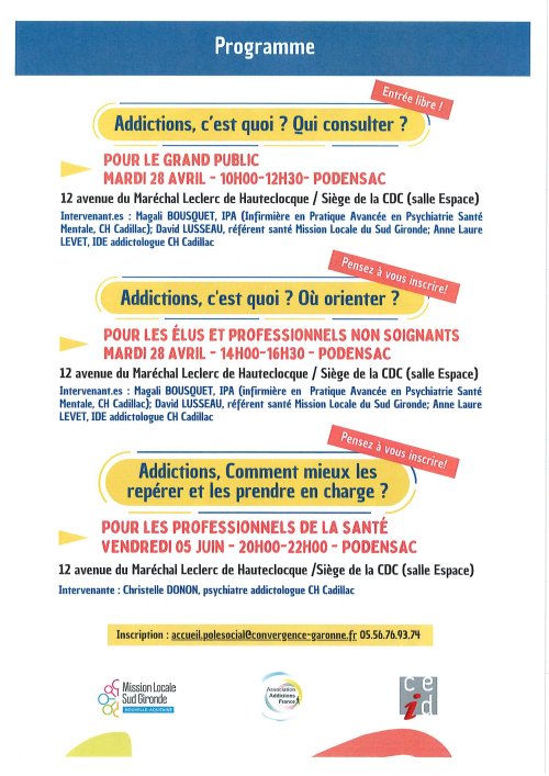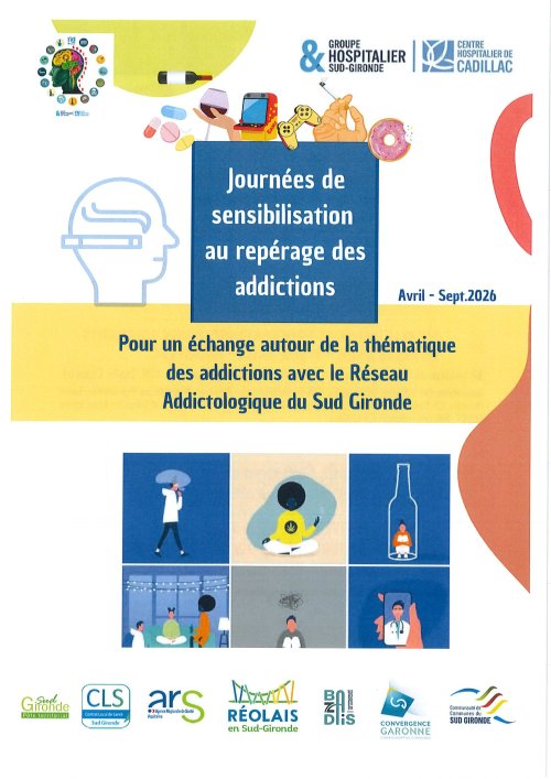 Les addictions peuvent toucher chacun d'entre nous. La filière d'addictologie du Centre Hospitalier de Cadillac, en partenariat avec la CDC Convergence Garonne, organise des ateliers gratuits pour apprendre à les repérer et orienter. Ces rencontres gratuites s'inscrivent dans le Contrat Local de Santé, piloté par le Pôle territorial du Sud Gironde. AU PROGRAMME : GRAND PUBLIC - Addictions : c'est quoi ? Qui consulter ? PROFESSIONNELS NON SOIGNANTS & ÉLUS - Addictions : c'est quoi ? Où orienter ? PROFESSIONNELS NON SOIGNANTS & ÉLUS - Addictions : Comment mieux les repérer et les prendre en charge ?Journées de sensibilisation au repérage des addictions : jeux, alcool, tabac, écrans…