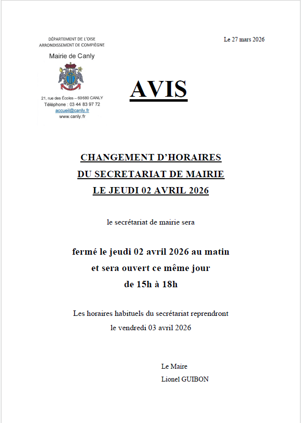 Fermeture du secrétariat de mairie Le secrétariat de mairie sera fermé le jeudi 02 avril 2026 au matin et sera ouvert ce même jour de 15h à 18h. Vous pouvez contacter le 06 76 23 40 54 en cas d’urgence. The post Avis fermeture secrétariat de mairie. appeared first on Canly.Avis fermeture secrétariat de mairie.