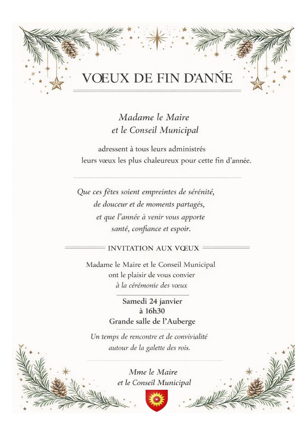 La Maire, le conseil municipal, les membres du CCAS ainsi que les employés municipaux, vous souhaitent de très belles fêtes de fin d’année, à partager en famille, et vous rappellent surtout de prendre soin de vous.